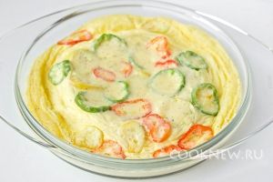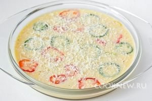 Выливаем омлетную массу в форму для микроволновой печи, сверху выкладываем кольца перца