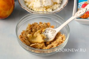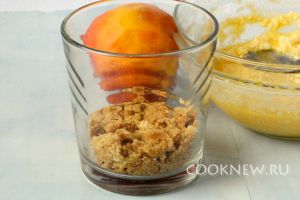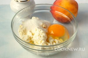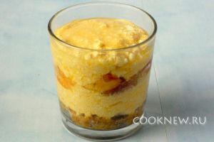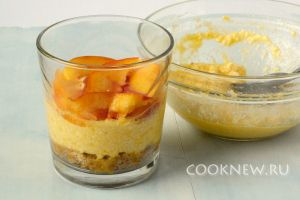 Сверху выложить половину творожной смеси. На творожный слой — кусочки персика