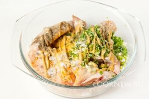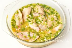 Солим крылья, добавляем чёрный молотый перец, куркуму, горчицу, измельчённый зелёный лук