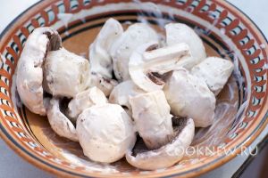 Грибы очистить, хорошо помыть, перемешать с майонезом, перцем и солью