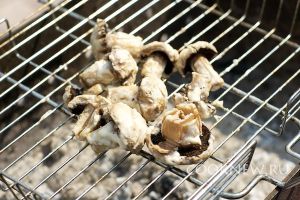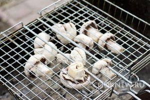 апекать грибы 7-10 минут, переворачивая решётку, чтобы шампиньоны равномерно запеклись