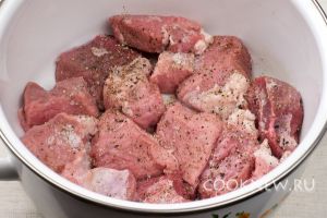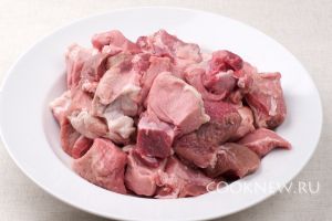 Мясо хорошо помыть, обсушить и порезать на куски со стороной 3-5 см