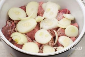 Сверху выложить слой лука — уложить слоями всё мясо с луком, каждый слой мяса присыпая перцем и солью.