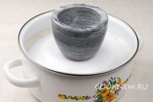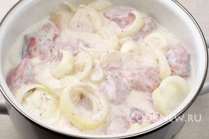 Влить в кастрюлю кефир, так чтобы он полностью покрыл мясо