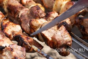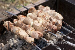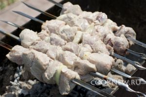 Шампура с мясом постоянно прокручивать над углями, чтобы шашлык равномерно разогревался и румянился
