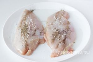 Куриные грудки посыпаем солью и чёрным молотым перцем