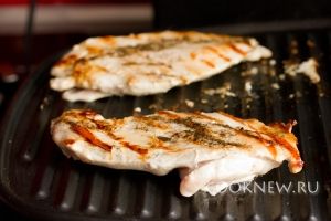 Обжариваем куриные грудки на гриле с двух сторон до появления полосочек. Внутри мясо может оставаться сырым, не страшно, так как мы его ещё будем тушить