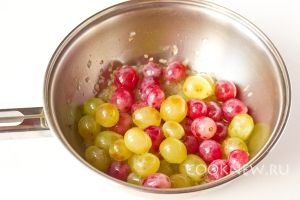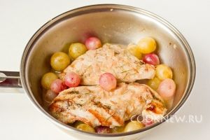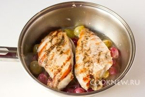 Выкладываем поверх винограда обжаренные ранее куриные грудки и вливаем вино. Делаем огонь средним, даём вину выпарится около 3-5 минут