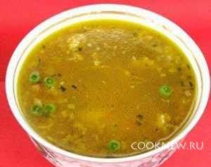 В кипящий бульон положить пассерованные овощи, через 10-15 минут – рис, кальмары, зелёный горошек и варить суп до готовности. Посыпать зеленью
