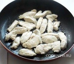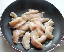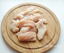 Куриную грудку моем и нарезаем небольшими полосками