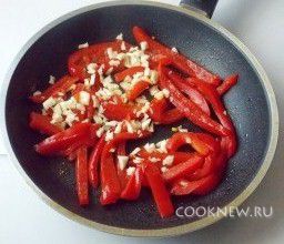Мелко режем чеснок. Добавляем его к перцу и жарим 5-7 минут