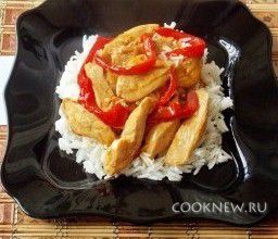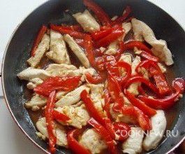 Куриную грудку соединяем с красным перцем, заливаем соусом и тушим минут 10, периодически помешивая, до загустения