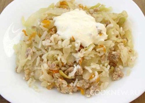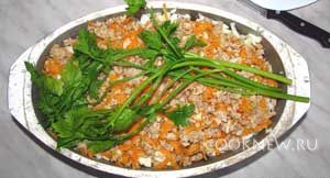 Накрываем блюдо крышкой и ставим на маленький огонь. Тушить 1,5- 2 часа. В первый час тушения крышку не снимать. Готовность проверяем по рису – если он мягкий, то блюдо готово. Перед подачей убрать петрушку и перемешать все слои. Подавать обязательно со сметаной