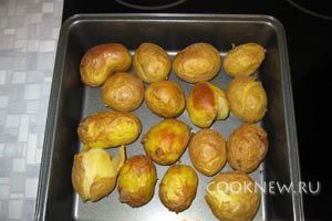 1 способ:В разогретую до 200 градусов духовку поместить картофель в мундире (не очищенный) и выпекать 1-1,5 часа до готовности. Запеченный картофель приобретает сладковатый вкус и желтый цвет в разрезе. Кожура картофеля при таком способе запекания становится вполне съедобной и ее едят вместе с сердцевиной