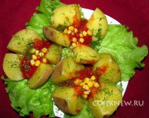 Соус делается очень просто: смешивается масло, лимонные сок (или уксус) и томатный сок. Картофель солим и перчим. В центр «цветка» заливаем около 2-х ст. л. соуса, сверху кладем кукурузу. Украшаем зеленью.