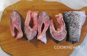 Чтобы рыба равномерно прожаривалась, ее нарезают на куски не толще 3 см