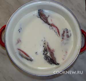 После замачивания в молоке рыбу нужно откинуть на дуршлаг, дать стечь молоку и промокнуть каждый кусочек бумажной салфеткой для удаления лишней жидкости