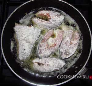 Далее берем сковородку и ставим ее на огонь. Сковороду нужно сильно разогреть, положить масло, а потом уже рыбу. Масла нужно столько, чтобы рыба была погружена в него наполовину. Пугаться такого количества масла не стоит – рыба лишнее в себя не впитает, зато покроется вкусной корочкой и равномерно прожарится.
