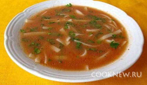 Дождаться, пока суп закипит и положить лапшу. Когда лапша будет готова, снять суп с огня. Перед подачей посыпать измельченной зеленью петрушки