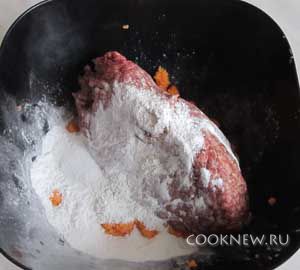 Смешать с очень мелко нарезанным чесноком и сырым яйцом. Добавить фарш и крахмал