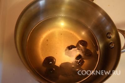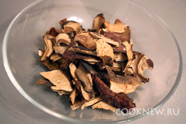 Сушеные грибы тщательно промыть, поломать руками на кусочки и отварить в течение 1 часа