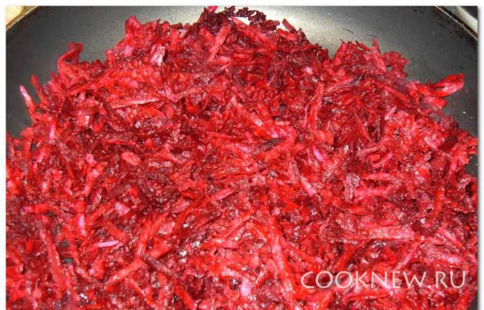 За это время очищенную свеклу потереть на крупной терке и потушить в глубокой сковородке с маслом