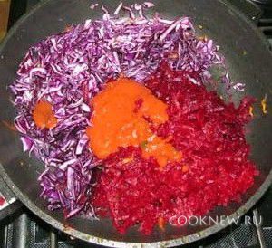 Добавить к свекле капусту, томатную пасту, перемешать и тушить 10 минут под крышкой.