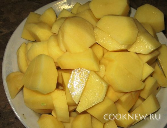 Пока овощи тушатся, очистить и порезать дольками картофель