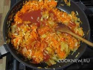 Заправка: морковь и лук нужно нарезать соломкой и спассеровать в растительном масле с 1 ст.л. томатного пюре и мукой
