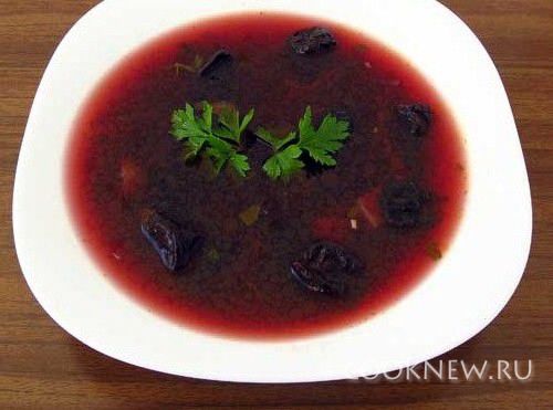 В кипящий грибной бульон опустить картофель и варить 5 минут. Потом добавить тушеные овощи и заправку для супа. Когда борщ начнет кипеть, добавить чернослив с отваром. Опять подождать пока борщ закипит, после чего посолить и поперчить по вкусу и варить еще 7-10 минут.При подаче украсить веточной петрушки