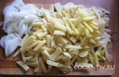Лук порезать тонкими полукольцами, картошку - средней соломкой