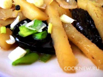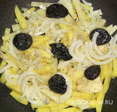 На дно сковороды выложить небольшой слой картошки, затем слой лука, несколько ягод чернослива, лавровый лист, посолить и поперчить по вкусу