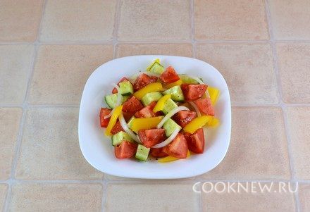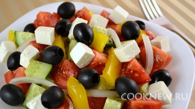 В тарелки выложить огурцы, помидоры, перец, лук. Полить оливковым маслом, посолить (немного, так как сыр достаточно соленый) и поперчить