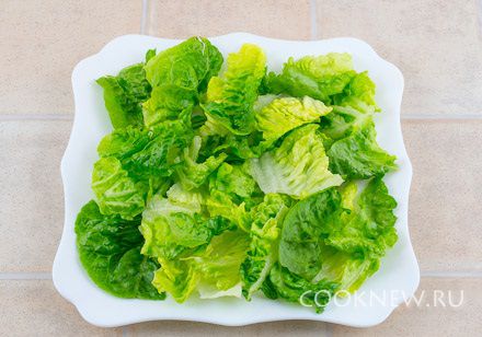 Формируем салат. Салатные листья помыть, обсушить, порвать кусочками и выложить на тарелку