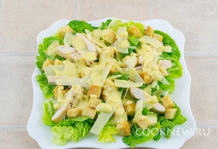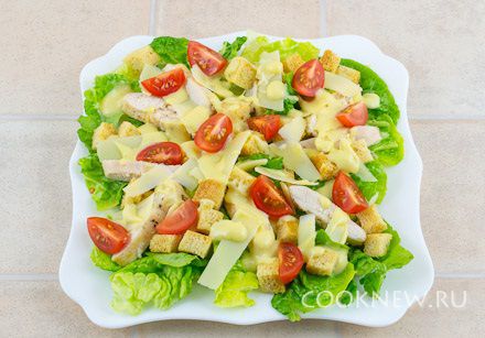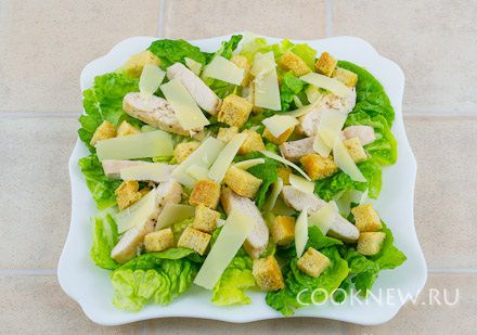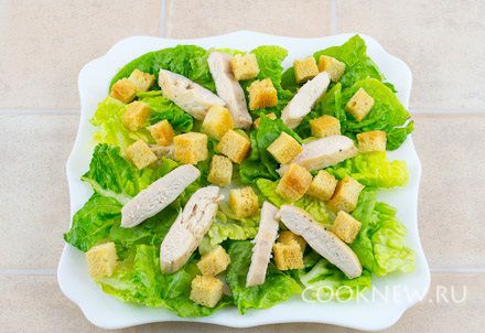 Сверху выложить чесночные сухарики и курицу, порезанную ломтиками