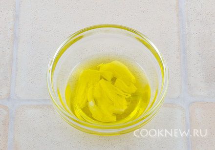 Сначала подготовим чесночные сухарики. Зубчик чеснока почистить, раздавить плоской стороной ножа. Положить его в небольшую емкость, залить 2 ст.л. оливкового масла. Поставить в микроволновку на 20-40 секунд. Благодаря этому масло и чеснок подогреется, в результате чего чеснок отдаст свой аромат маслу
