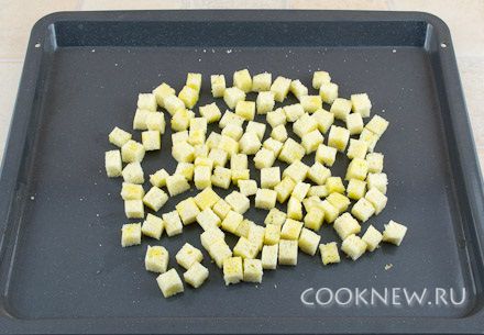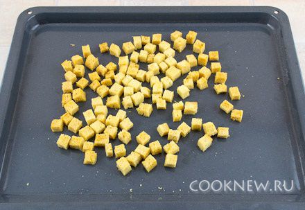 С батона срезать корку, порезать хлеб небольшими кубиками. Разложить на противне, равномерно полить полученным маслом, перемешать