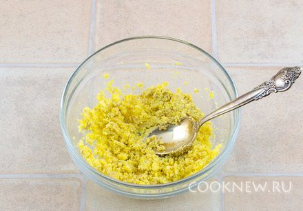 Подготовим заправку. Яйца отварить в течение 5 минут с момента закипания. Охладить, залив холодной водой, затем отделить белки от желтков. Желтки, горчицу и чеснок, выдавленный через чеснокодавилку, тщательно растереть.
