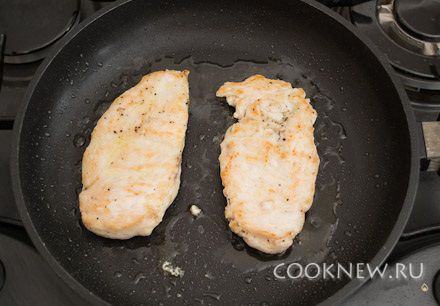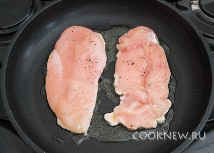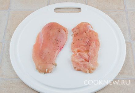 Куриное филе разрезать вдоль на два тонких пласта. Посолить, поперчить