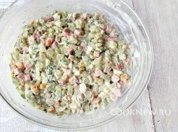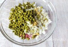 Перемешиваем салат. Салат Оливье перед подачей к столу должен как следует пропитаться, поэтому ставим его в холодильник на 1 час