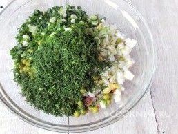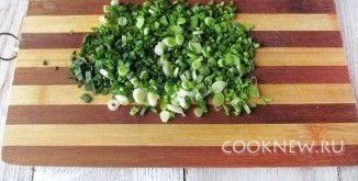 Зелёный лук моем под струёй холодной проточной воды, нарезаем перья тонкими колечками. также измельчаем укроп