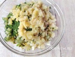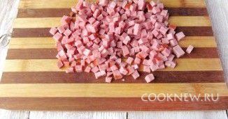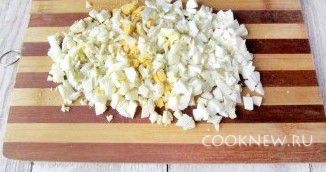 Остывшие отваренные яйца очищаем от скорлупы, нарезаем кубиками
