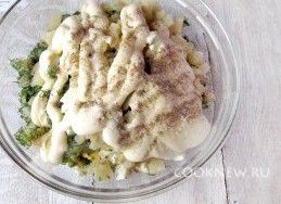 Заправляем салат майонезом, добавляем соль и чёрный молотый перец по вкусу