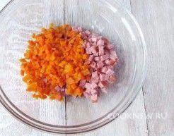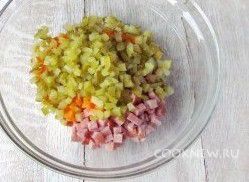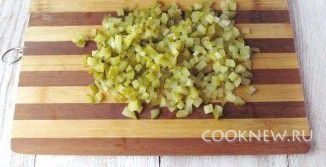 Солёные огурцы нарезаем кубиками, по размеру схожими с кубиками моркови