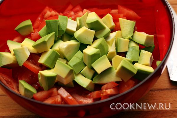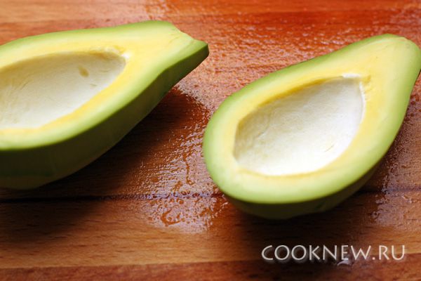 Спелый авокадо разрежьте пополам, выньте косточку и снимите шкурку