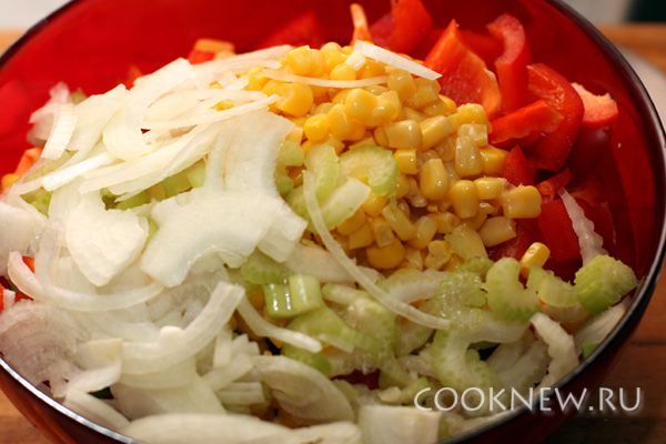 К овощам добавьте молодую кукурузу. Она может быть свежей, консервированной или замороженной.