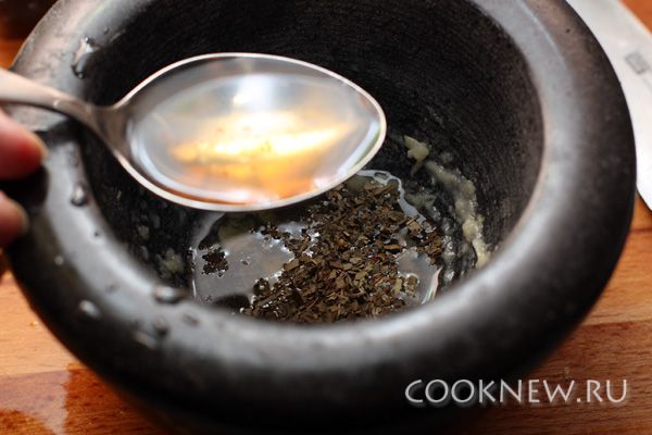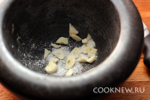 Чеснок разотрите в ступке с солью до кашицеобразного состояния