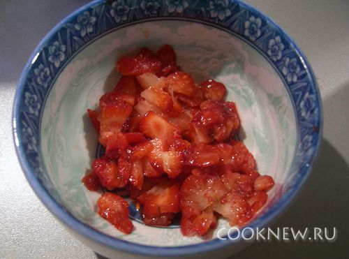 Несколько ягод клубники разминаем и смешиваем с йогуртом