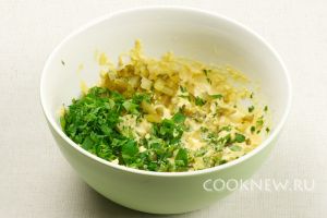 Добавить зелень и огурцы к желткам