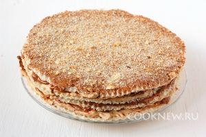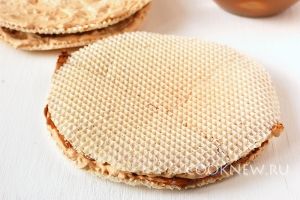 Соединить двойные коржи между собой слоем крема. Верх торта смазать кремом и посыпать вафельной крошкой. Лучше, чтобы торт пропитался 2-3 часа.
